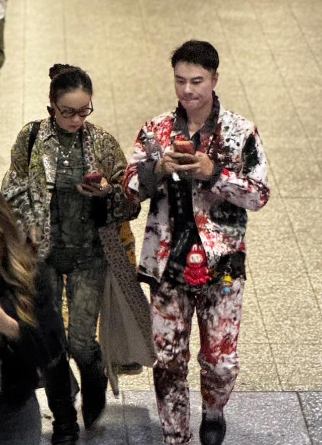 在那英强大的气场旁,一位同行的年轻男士同样吸引了不少目光。这位男士皮肤白皙,一头利落的短发,五官清秀帅气。他的穿搭也极具个性,黑色上衣搭配一套色彩斑斓的花色套装,脚踩一双黑色鞋子,整体风格大胆而前卫,与那英的潮酷装扮相得益彰。
