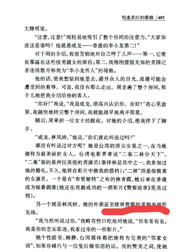 再回到成龙的自传,她说妻子是他见过最美丽的女人。