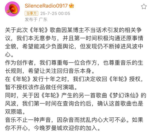 7月25日,汪苏泷方回应,关于此次《年轮》歌曲因某博主不当话术引发的相关争议,本无意参与,而且第一时间积极沟通还原事情全貌,希望能减少负面舆论,但发现仍不断掉进风波中心。同时宣布,“在《年轮》发行十年之时,我们决定收回《年轮》授权,暂不授权该作品做任何演唱。”
