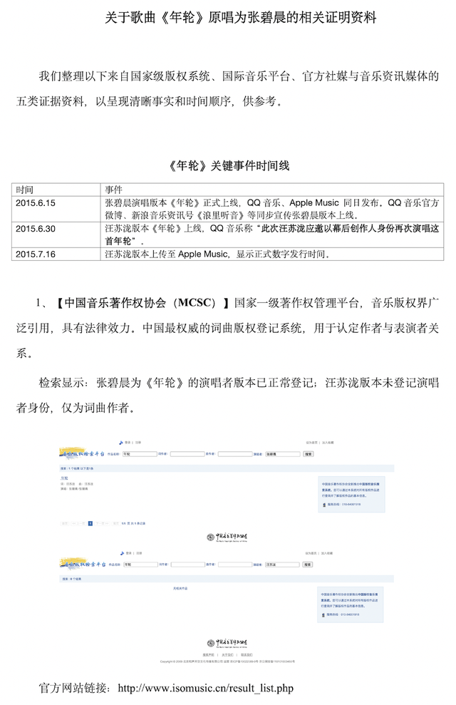 同时,张碧晨方梳理了关于《年轮》的时间线,提供了中国音乐著作权协会登记信息、中国尺度录音制品编码中心存案信息、音乐平台歌曲信息等五类证据资料。“尽管汪苏泷是该作品的创作者之一,但他在张碧晨版本之后才有演唱或其他形式的公开演绎,因此在行业规则与法律视角中,张碧晨是唯一符合‘原唱’尺度的演唱者。”