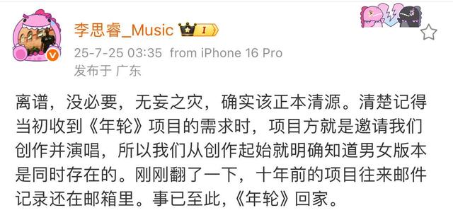 汪苏泷所属大象无形音乐有限公司的总经理李思睿也发文体现,清楚记得当年收到《年轮》项目的需求时,已明确知道男女版本是同时存在的,“十年前的项目往来邮件记录还在邮箱里”。