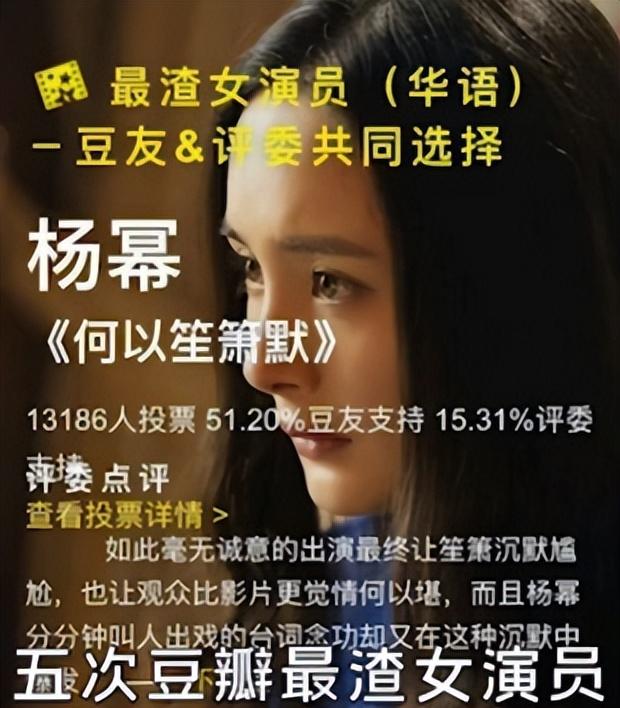 之后《大武当之天地密码》《hold住爱》《小时代3》《分手大师》《小时代4》《何以笙箫默》这几部电影更是让杨幂喜提三次金扫帚奖,五次豆瓣最渣女演员。