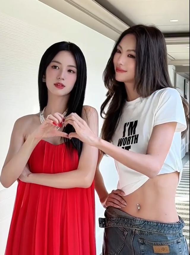 这下热闹了。一样的衣服,最考验的就是硬件。单看吴千语,完美。可腻腻一站到她旁边,情况就不一样了。腻腻的资料上写着身高174厘米,就这多出来的4厘米,在镜头里被放大了无数倍。